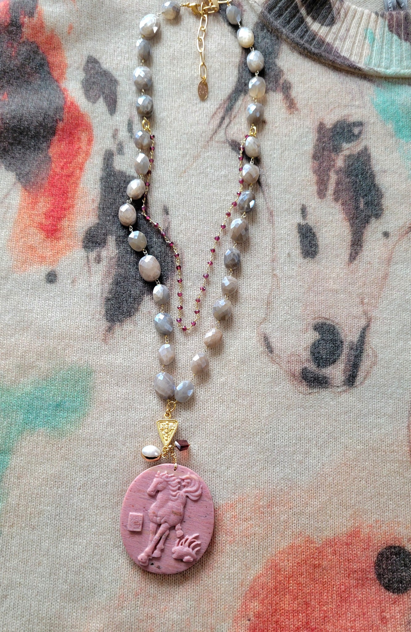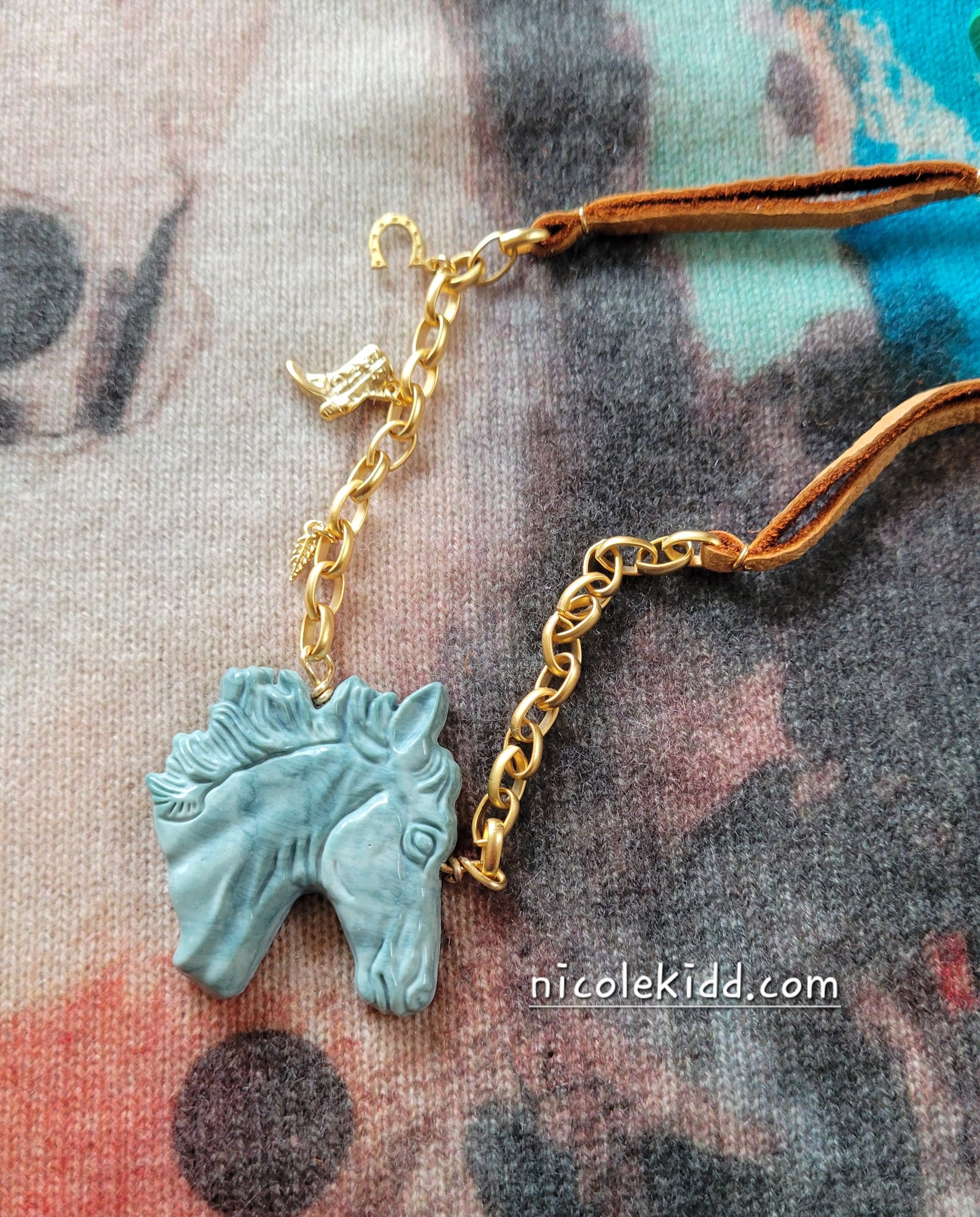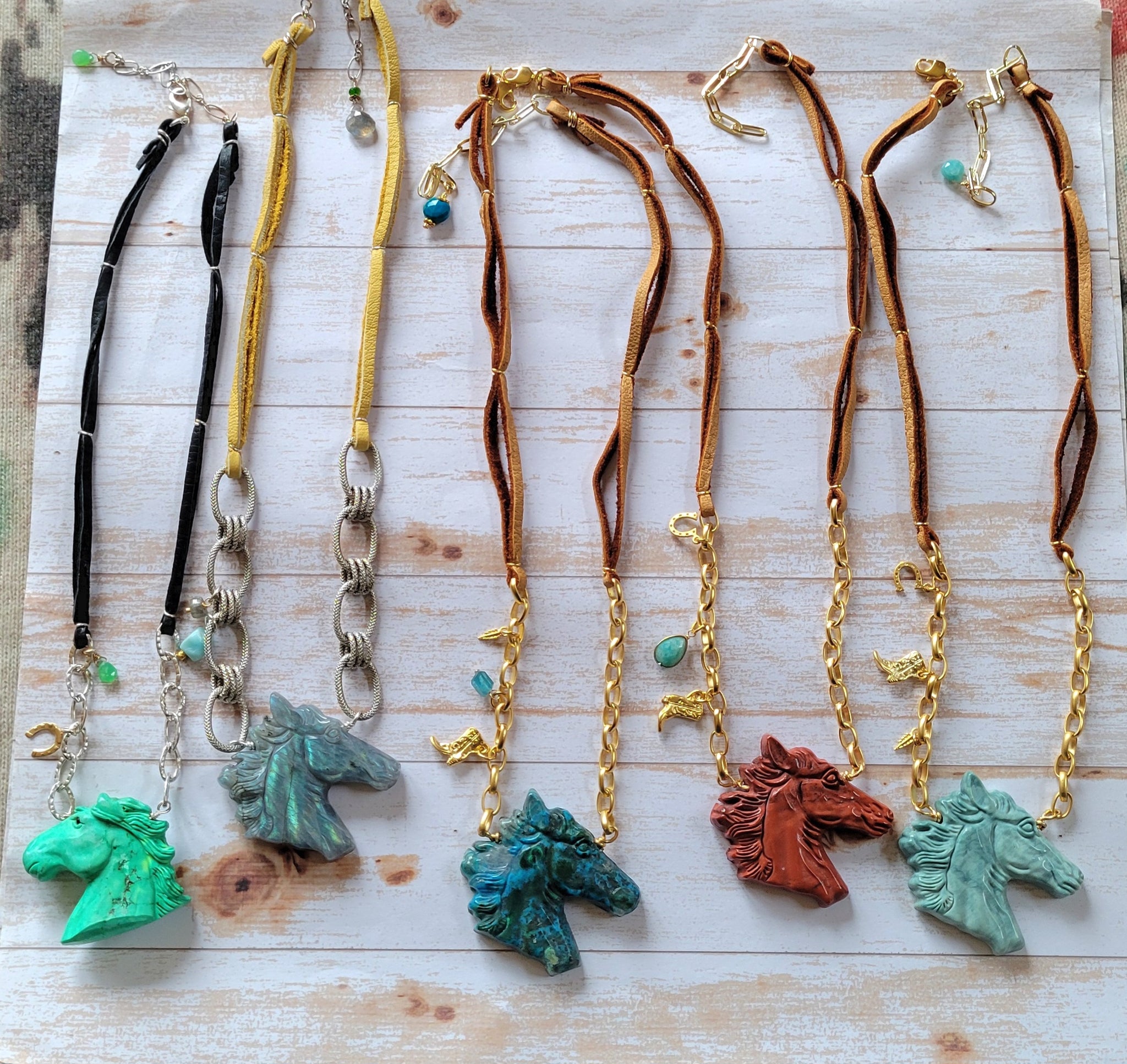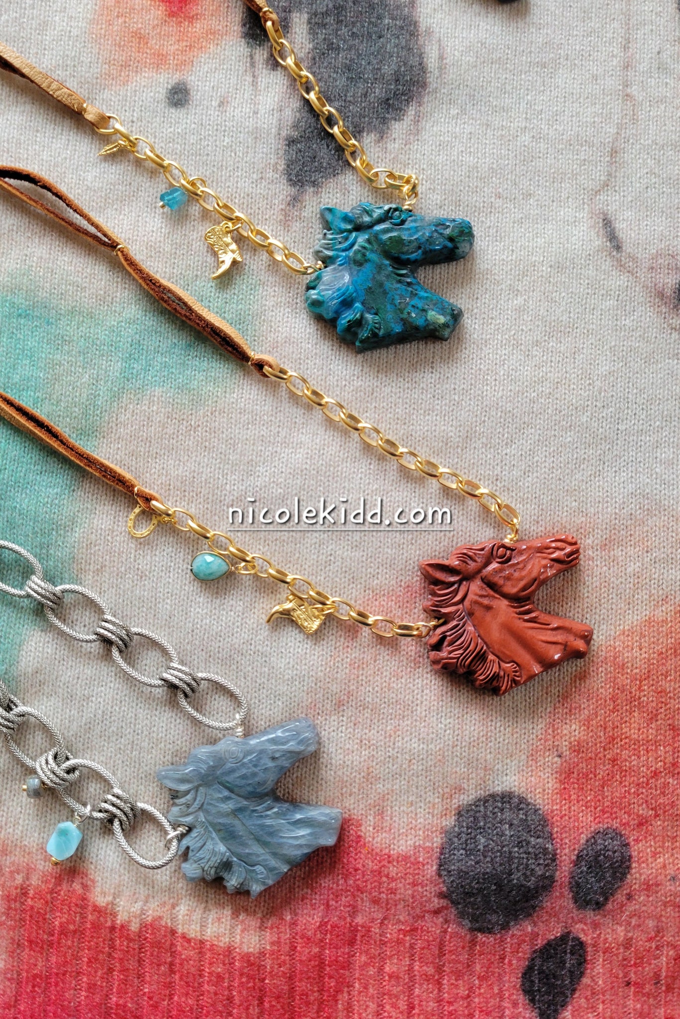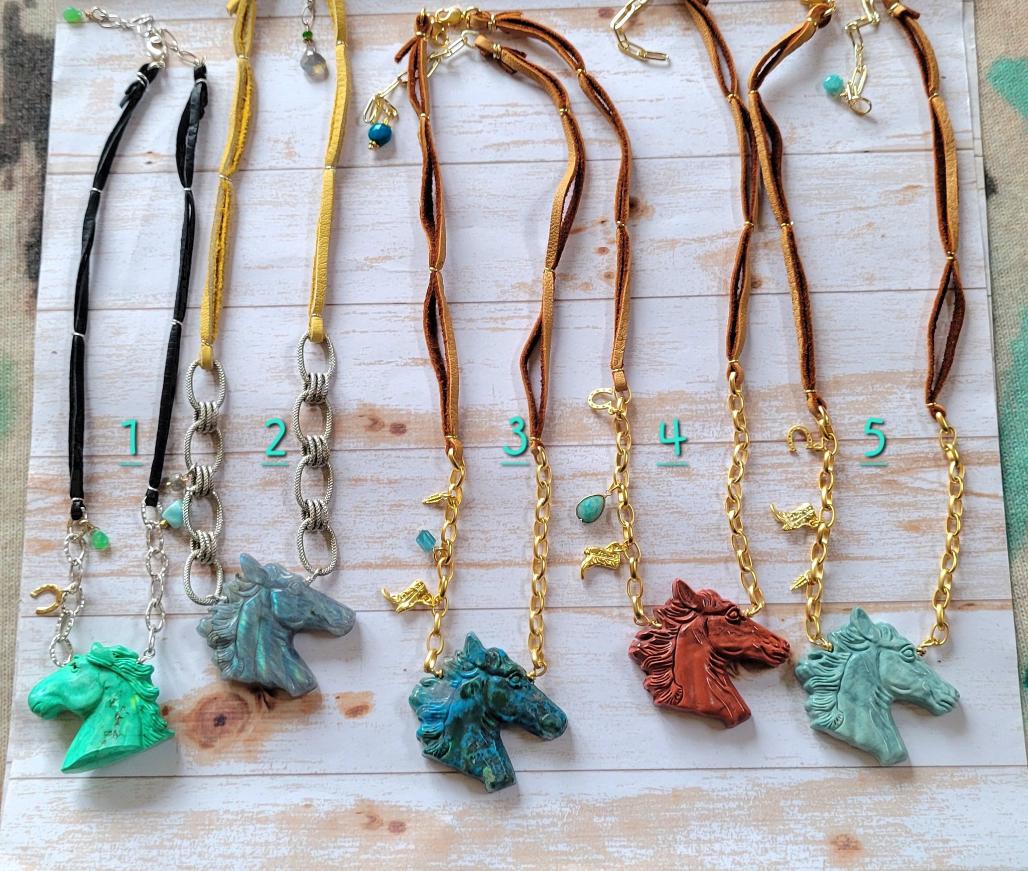 Year of the Horse 🐎-Expressing your powerful individuality: A bejeweled interpretation of the raw power, resilience and awe-inspiring beauty of horses we so admire. These first five beauties are hand-carved horse busts, made of Howlite, Labradorite, Chrysocolla, Red River Jasper, and Natural Wave Jasper, tethered with various decorative chains (18k gold-plated, silver plated/sterling) to soft genuine deer leather. The hand-carved pink medallion is made of Rhodonite ("Stone of Love"), garnets and silverite (coated) moonstones. Each design features additional horse-charms: 14k gold-fill cowboy boot, 14k gold-fill horseshoe and feather or a complementary gemstone.